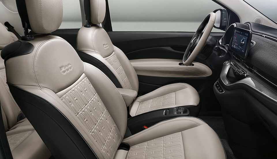 Svaki detalj bit će tako dizajniran da se postigne veća prostranost uz uporabu prirodnih i sirovih materijala. Vaši predmeti imat će više prostora nego ikada prije. Novi nadolazeći model 500 «la Prima» imat će obnovljene pretince za odlaganje, s držačem pametnog telefona i izvlačnim držačem za čaše, kako bi sve bilo pri ruci i kako bi vožnja bila uz manje stresa. Odgovarajući logotip s klasičnom značkom 500 obogaćuje upravljač izvrsnog izgleda, ponovo oblikovan kako bi se istaknuo osnovni stil s dvije prečke Fiata 500 iz ’57. I sjedala bez kože u novom modelu 500 «la Prima» predstavljaju novinu. Ukrašena Fiatovim monogramom, mogu se podešavati u raznim smjerovima (regulacija u 6 smjerova), bolje obuhvaćaju tijelo i grijana su.